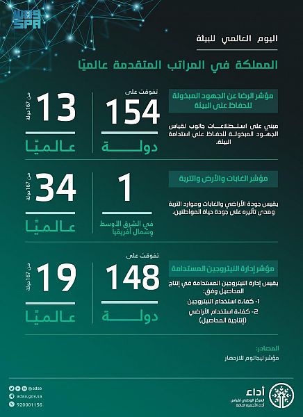 وقد جاء تقدم تلك المؤشرات والمراتب التي حققتها المملكة من اهتمام ورعاية ودعم القيادة الرشيدة – حفظها الله – في رفع مستوى جودة الحياة والمحافظة على البيئة ومواردها الطبيعية التي تحقق الأمن البيئي المستدام، وتحقيقاً لرؤية 2030 ومبادراتها العالمية التي أشادت بها دول العالم وقادتها من خلال مبادرة السعودية الخضراء ومبادرة الشرق الأوسط الأخضر.