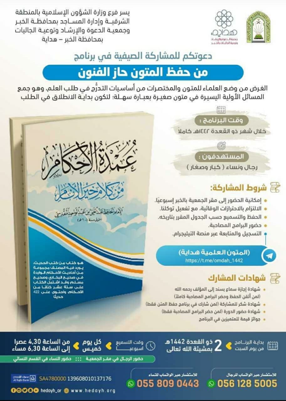 ينظم فرع وزارة الشؤون الإسلامية والدعوة والإرشاد بالمنطقة الشرقية، بالتعاون مع جمعية الدعوة والإرشاد وتوعية الجاليات بمحافظة الخبر “هداية”، في الثاني من شهر ذي القعدة القادم، البرنامج الصيفي الدعوي (من حفظ المتون حاز الفنون)، ويستمر طيلة الشهر في مقر الجمعية.