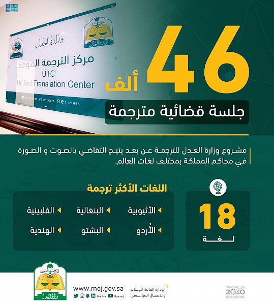 كشفت وزارة العدل، عن ترجمة أكثر من 46 ألف جلسة قضائية عن بعد، من خلال مركز الترجمة الموحد، منذ إطلاق المركز أبريل 2019.