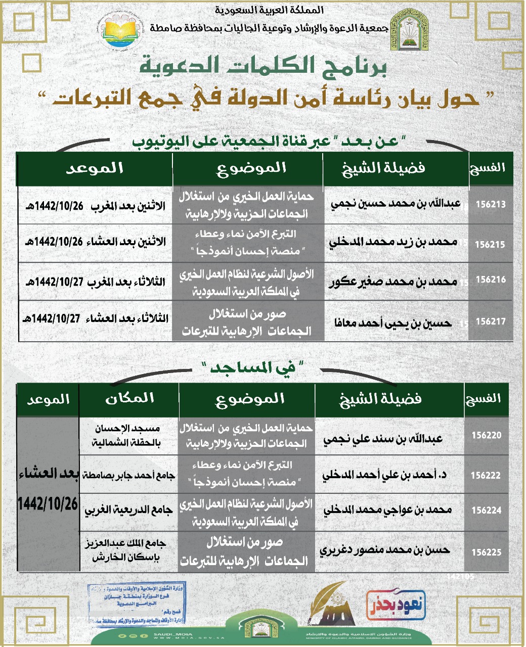 وصرّح رئيس مجلس إدارة جمعية الدعوة والإرشاد وتوعية الجاليات بمحافظة صامطة، الشيخ محمد بن زيد المدخلي، بأن هذه الكلمات الدعوية التوعوية تنفَّذ ضمن المناشط والبرامج التي تنفِّذها جمعية الدعوة، وبمتابعة مباشرة من مدير فرع وزارة الشؤون الإسلامية بمنطقة جازان، الشيخ أسامة بن زيد المدخلي، مواكبة لجهود وزارة الشؤون الإسلامية الدعوية والتوعوية، وتزامنًا مع بيان رئاسة أمن الدولة التحذيري، وتماشيًا مع تعليمات الدولة -أيدها الله- في أن تكون التبرعات وفق المنصات الرسمية للتبرع لضمان وصولها لمستحقيها.