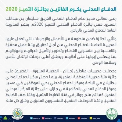 رعى معالي مدير عام الدفاع المدني الفريق سليمان بن عبدالله العمرو، حفل جائزة الدفاع المدني للتميز 2020م، بمقر المديرية العامة للدفاع المدني بالرياض.