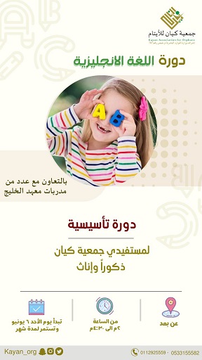 وإيمانا من جمعية “كيان” للأيتام ذوي الظروف الخاصة بتمكين مستفيديها “الأيتام” عن طريق التعليم والتدريب وورش العمل والندوات، أقامت الجمعية “دورة اللغة الانجليزية التأسيسية” لمستفيديها بالتعاون مع مدربات من معهد الخليج للتدريب والتعليم.