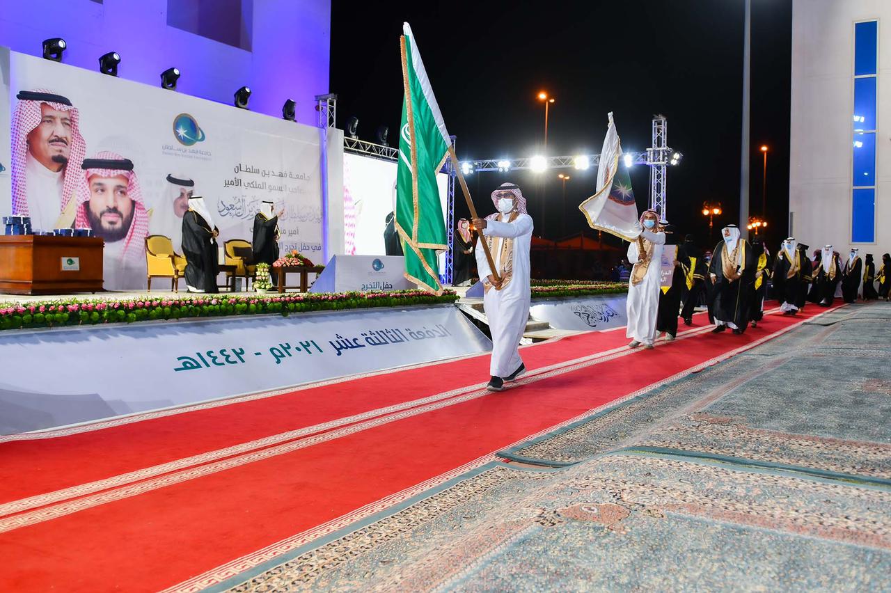 رعى صاحب السمو الملكي الأمير فهد بن سلطان بن عبدالعزيز أمير منطقة تبوك رئيس مجلس أمناء جامعة فهد بن سلطان مساء أمس ، حفل تخريج الدفعة الـ 13 من طلاب وطالبات الجامعة من حملة درجة البكالوريوس ، والدفعة الثامنة من حملة الماجستير للعام الجامعي 1441 /1442هـ ، والبالغ عددهم 465 طالب وطالبة , حيث كان في استقبال سموه لدى وصوله لمقر الجامعة رئيس الجامعة الدكتور محمد بن عبدالله اللحيدان.