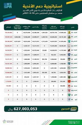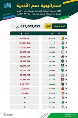 أعلنت لجنة الكفاءة المالية للأندية الرياضية، اليوم الخميس 10 يونيو 2021م، إجمالي الالتزامات المالية واجبة السداد حتى 30 أبريل 2021م، لأندية دوري كأس الأمير محمد بن سلمان للمحترفين، والتي بلغ إجماليها ما قيمته 627,003,053 ريالاً، وذلك على النحو التالي: