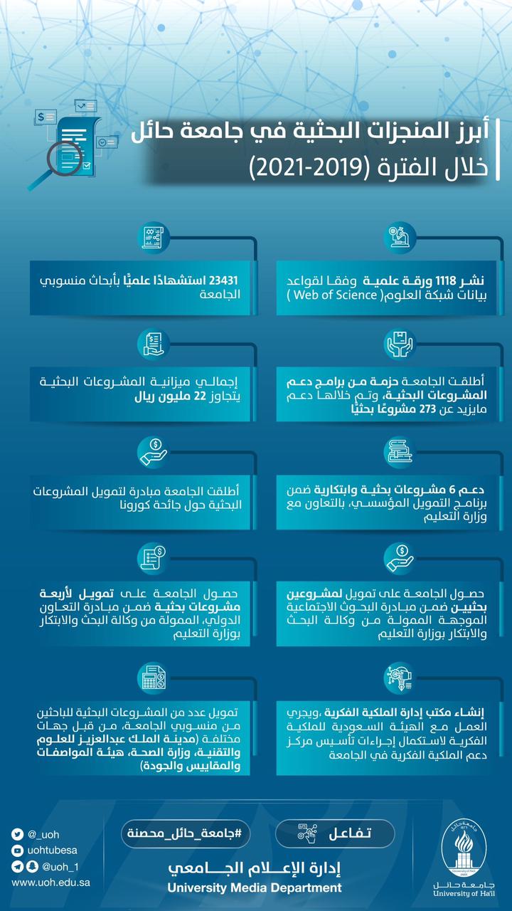 تواصل جامعة حائل، ممثلة في وكالة الجامعة للدراسات العليا والبحث العلمي، جهودها وسعيها إلى تحقيق التميز والريادة في مجالات البحث العلمي؛ لتطوير المجتمع، ودعم التنمية المستدامة في العديد من التخصصات، سعياً لتطوير الحلول العلمية والعملية للمشكلات التي تواجه المجتمع، من خلال الأبحاث والدراسات العلمية.