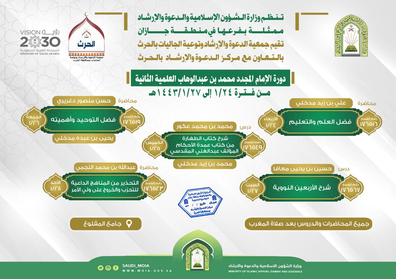 تنظم وزارة الشؤون الإسلامية والدعوة والإرشاد ممثلة بفرعها في منطقة جازان دورة الإمام محمد بن عبد الوهاب العلمية الثانية والتي تنطلق مساء اليوم الأربعاء الرابع والعشرون من شهر محرم 1443 هجرية ويشارك فيها فضيلة الشيخ علي بن زيد المدخلي بمحاضرة عنوانها (فضل العلم والتعليم ) وفضيلة الشيخ محمد بن محمد عكور بدرس في (شرح كتاب الظهارة من كتاب عمدة الأحكام لعبد الغني المقدسي) وفضيلة الشيخ يحيى بن عبده مدخلي بمحاضرة عنوانها ( فضل التوحيد وأهميته) وفضيلة الشيخ حسين بن يحيى معافا ودرس في (شرح الأربعين النووية) وفضيلة الشيخ عبد الله بن محمد النجمي بمحاضرة عنوانها (التحذير من المناهج الداعية للتحزب والخروج على ولي الأمر) .