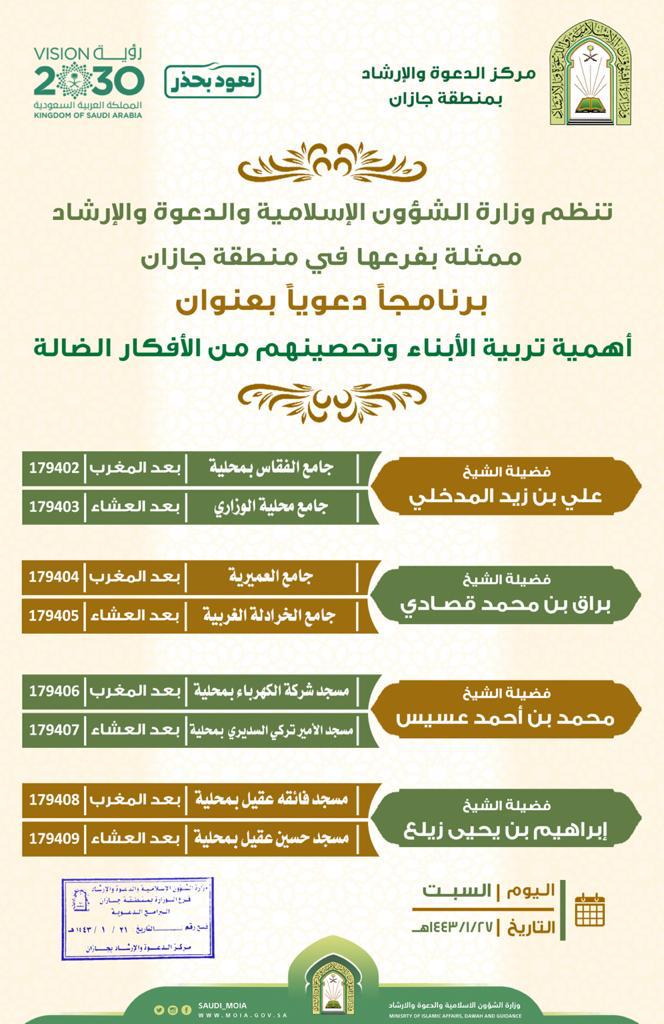 تنظم وزارة الشؤون الإسلامية والدعوة والإرشاد ممثلة بفرعها في منطقة جازان برنامجاً دعوياً بعنوان ” أهمية تربية الأبناء وتحصينهم من الأفكار الضالة ” مساء السبت الموافق 27 / 1 / 1443 هـ ، هذا وسيتحدث فضيلة الشيخ علي بن زيد المدخلي بجامعي الفقاس بمحلية وجامع محلية الوزاري وفضيلة الشيخ براق بن محمد قصادي بجامعي العميرية وجامع الخرادلة الغربية وفضيلة الشيخ محمد بن أحمد عسيس بِمَسجدي شركة الكهرباء بمحلية ومسجد الأمير تركي السديري بمحلية وفضيلة الشيخ إبراهيم بن يحيى زيلع بمسجدي فائقة عقيل وحسين عقيل بمحلية .