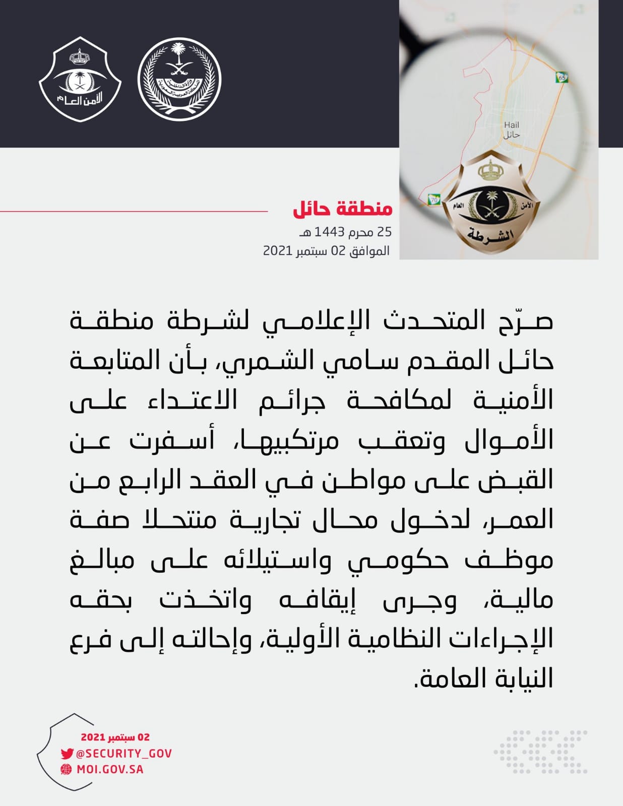 صرّح المتحدث الإعلامي لشرطة منطقة حائل المقدم سامي بن فهيد الشمري ، بأن المتابعة الأمنية لمكافحة جرائم الاعتداء على الأموال وتعقب مرتكبيها، أسفرت – بفضل الله – عن تمكن الجهة المختصة بشرطة المنطقة من القبض على مواطن بالعقد الرابع من العمر قام بإنتحال صفة مفتش بمكتب العمل والإستيلاء على مبالغ مالية من أحد المحلات التجارية .