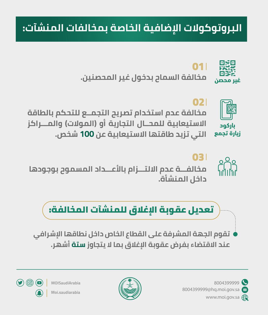 صرح مصدر مسؤول في وزارة الداخلية، بأنه إلحاقًا لما سبق إعلانه بتاريخ 29 رمضان 1442هـ بشأن تعديل جدول تصنيف عقوبات مخالفات الإجراءات الاحترازية والتدابير (البروتوكولات) الوقائية المتخذة من الجهات المعنية لمواجهة جائحة فيروس كورونا (COVID-19)، فقد تقرر إضافة التالي، وفقًا لمخالفة البروتوكولات الخاصة بالمنشآت: 1- مخالفة السماح بدخول غير المحصنين.