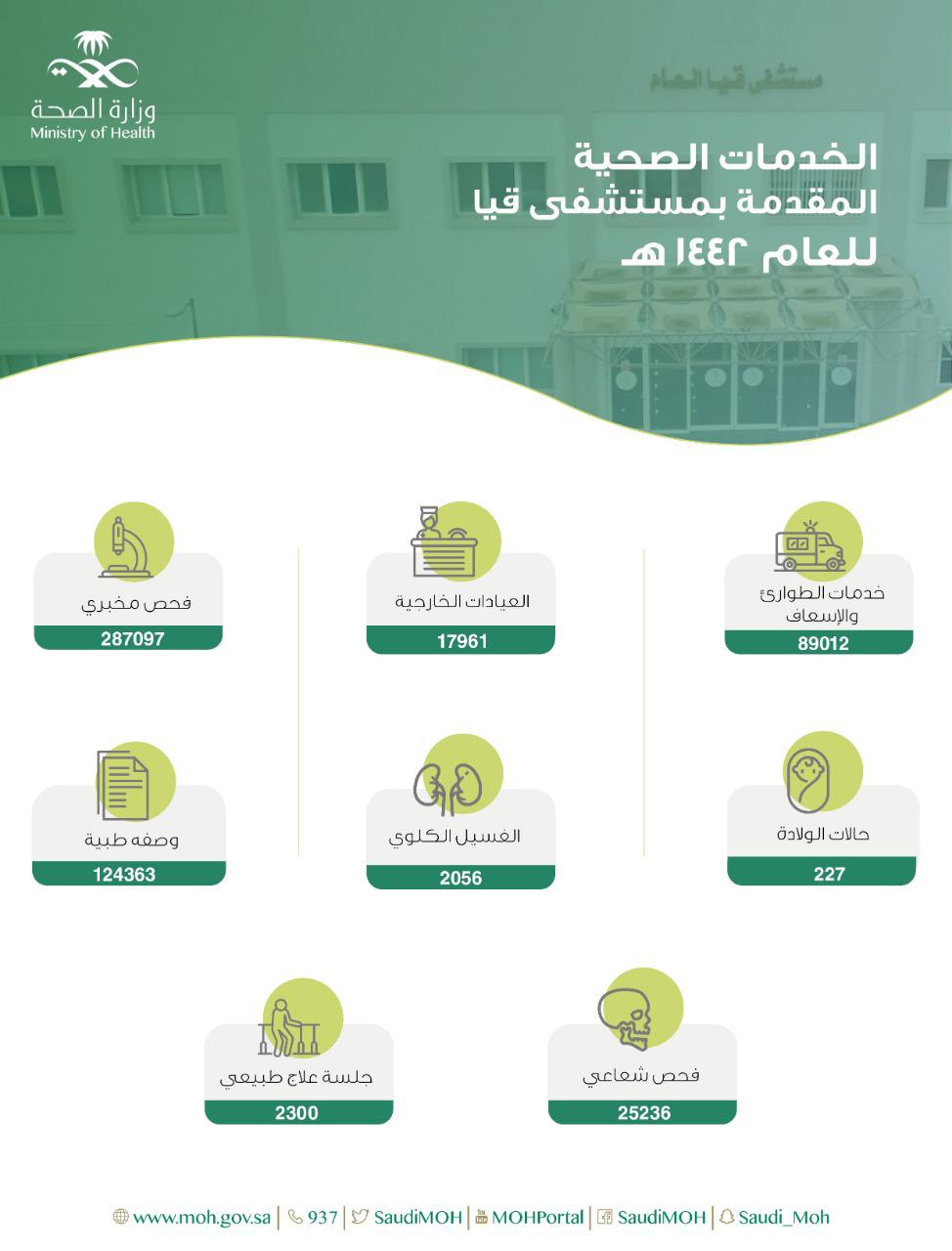 قدّم مستشفى قيا العام خدماته لعدد 106973 مستفيداً خلال العام 1442 هـ