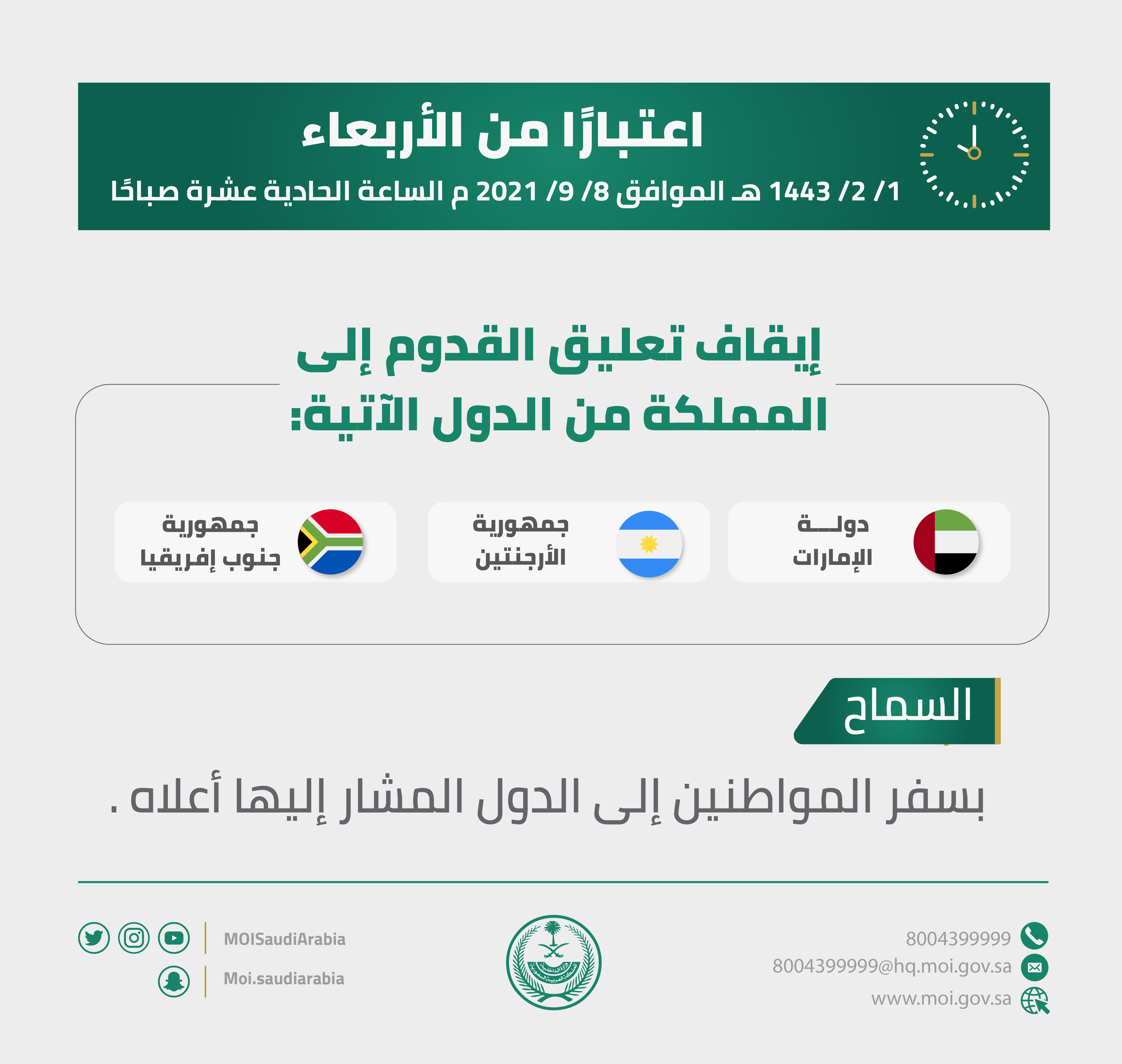 وبناءً على ما رفعته الجهات الصحية المختصة عن تطورات جائحة فيروس كورونا المستجد (كوفيد – 19)، ومدى استقرار الوضع الوبائي في جميع دول العالم، فقد تقرر إيقاف تعليق القدوم إلى المملكة عبر المنافذ البرية والبحرية والجوية، اعتبارًا من الساعة 11:00 من صباح يوم الأربعاء 1 صفر 1443 هـ الموافق 8 سبتمبر 2021 م، وذلك من الدول الثلاث الآتية: