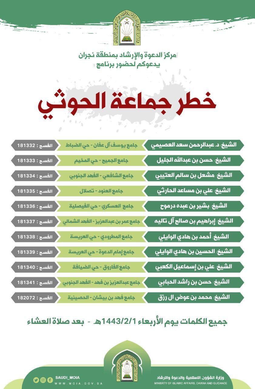 ينظم فرع وزارة الشؤون الإسلامية والدعوة والإرشاد بمنطقة نجران، اليوم، برنامجاً دعوياً بعنوان: (خطر جماعة الحوثي).. يشتمل على 11 كلمة يشارك فيه عدد من الدعاة في عدد من جوامع مدينة نجران، بعد صلاة العشاء، لفضح جماعة الحوثي وبيان خطرها .