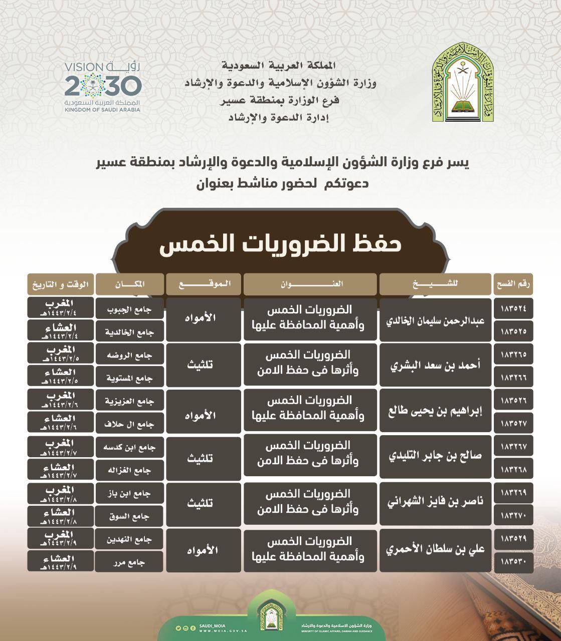 وسيتحدث الدعاة خلال المحاضرات عن الضروريات الخمس وأهمية المحافظة عليها، وأثرها في حفظ الأمن.. حيث يلقيها في اليوم الأول عبدالرحمن بن سليمان الخالدي بجوامع الجبوب والخالدية في الأمواه، وفي اليوم الثاني أحمد بن سعد البشري في جوامع الروضة والمستوية بتثليث.. فيما يلقيها في اليوم الثالث إبراهيم بن يحيى طالع بجوامع العزيزية وآل حلاف بالأمواه.