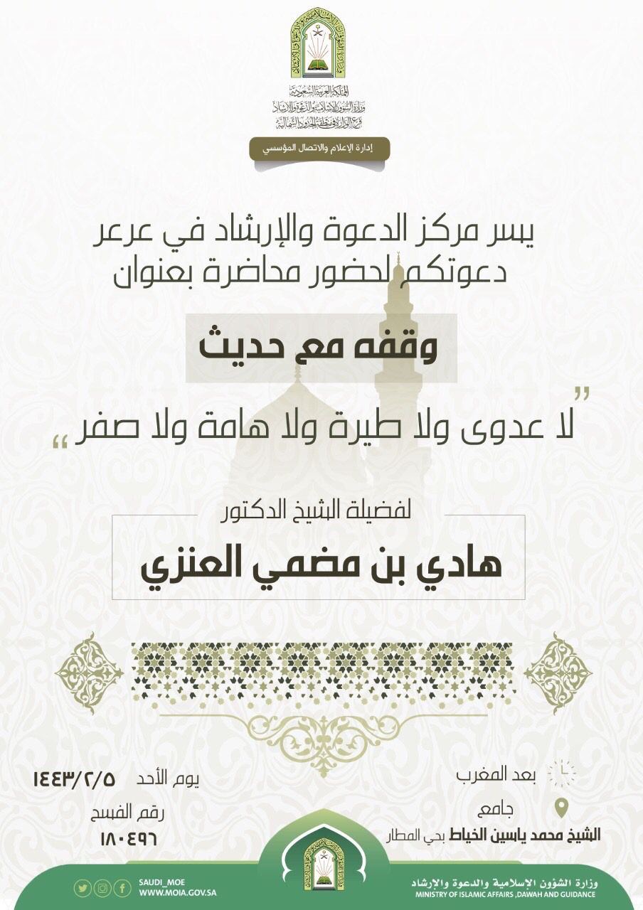 ينظم فرع وزارة الشؤون الإسلامية والدعوة والإرشاد بمنطقة الحدود الشمالية، ممثلاً بمركز الدعوة والإرشاد في عرعر، اليوم، محاضرة بعنوان: وقفه مع حديث (لاعدوى ولا طيرة ولا هامة ولا صفر)، يلقيها الشيخ الدكتور هادي بن مضمي العنزي، وذلك في جامع الشيخ محمد ياسين الخياط بحي المطار بعد المغرب.