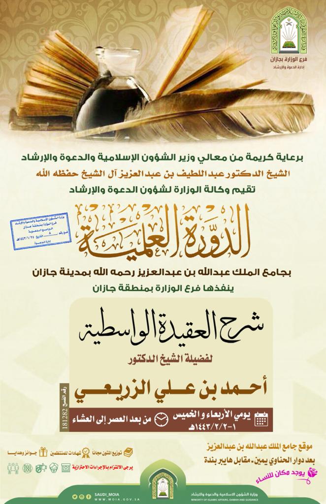 برعاية كريمة من معالي وزير الشؤون الإسلامية والدعوة والإرشاد فضيلة الشيخ الدكتور / عبداللطيف بن عبدالعزيز آل الشيخ ، نَنفذ فرع وزارة الشؤون الإسلامية والدعوة والإرشاد في منطقة جازان مساء الاثنين الموافق 29 / 1 / 1443 للهجرة ، محاضرة دعوية بعنوان ” شرح المنظومة البيقونية ” وذلك بجامع الملك عبدالله بن عبدالعزيز – رحمه الله – بمدينة جازان من بعد صلاة العصر إلى العشاء ، قدمها فضيلة الشيخ عبدالله بن محمد النجمي وتأتي هذه المحاضرة ضمن الدورة العلمية التي تُقيمها وكالة الوزارة لشؤون الدعوة والإرشاد والتي انطلقت يوم السبت الماضي .
