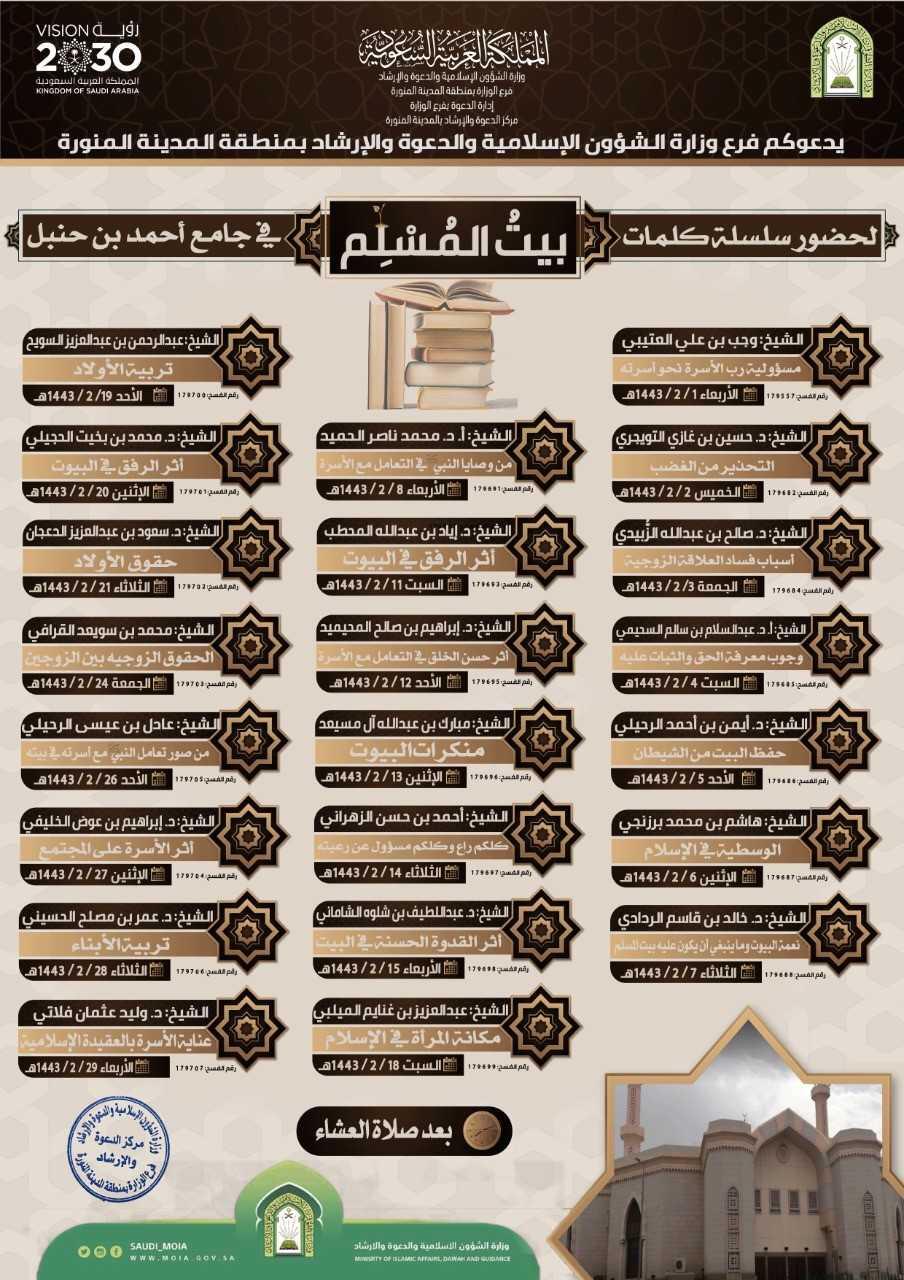 أخبار محلية > بيت المسلم” .. سلسلة كلمات دعوية بجامع الإمام أحمد بن حنبل بالمدينة المنورة