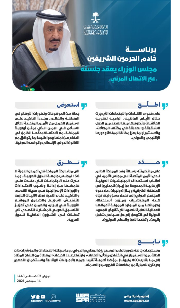 وبين معاليه أن مجلس الوزراء تابع مستجدات جائحة كورونا على المستويين المحلي والدولي، وما سجلته الإحصاءات والمؤشرات ذات الصلة، من الاستمرار في انخفاض منحنى الإصابات، وارتفاع عدد الجرعات المعطاة من اللقاح المضاد إلى ما يقارب ( 40 مليوناً )، مؤكداً أهمية تقيد الجميع بالإجراءات الوقائية واستكمال التحصين بجرعتين للحماية من مضاعفات الفيروس والحد منه.