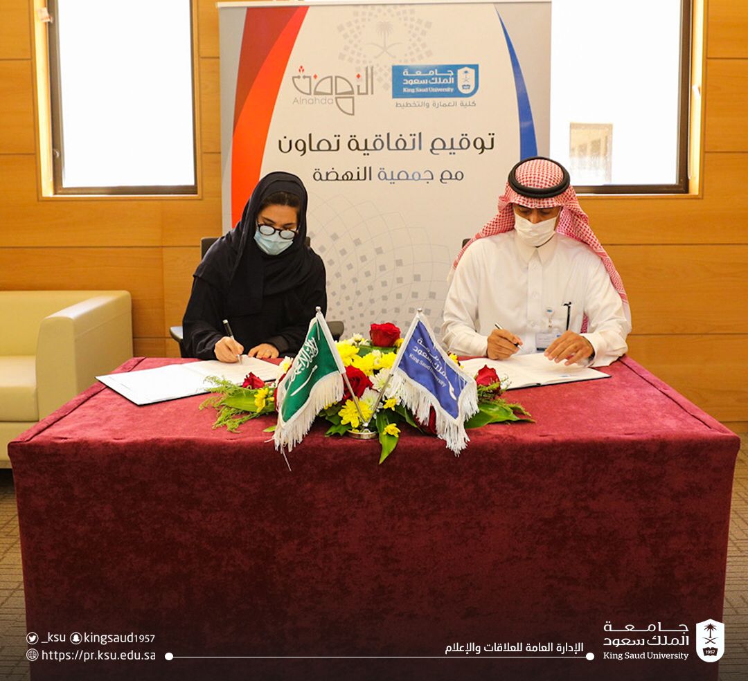 وقعت كلية العمارة والتخطيط بجامعة الملك سعود ظهر أمس الاثنين 6/2/1443هـ اتفاقية تعاون مع جمعية النهضة وذلك في مقر الكلية وقد قام بتوقيع الاتفاقية نيابة عن معالي رئيس جامعة الملك سعود سعادة عميد كلية العمارة والتخطيط الأستاذ الدكتور عبدالعزيز الدغيشم ومن جانب الجمعية الأستاذة رشا التركي المديرة التنفيذية لجمعية النهضة.