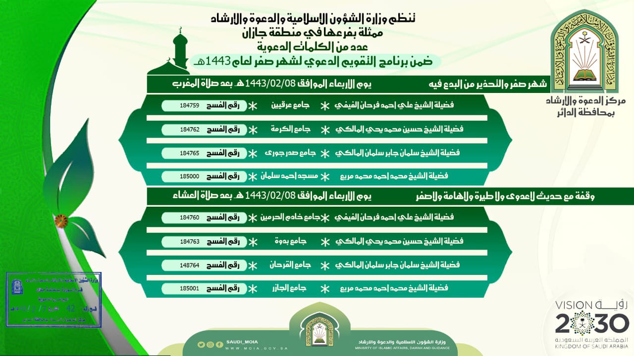 تنظم وزارة الشؤون الإسلامية والدعوة والإرشاد ممثلة بفرعها في منطقة جازان “مركز دعوة الدائر” كلمات دعوية ضمن برنامج التقويم الدعوي لشهر صفر لهذا العام وتنفذ يوم الأربعاء الموافق 8 / 2 / 1443 هـ ، كلمة بعنوان ” شهر صفر والتحذير من البدع فيه ” هذا وسيتحدث عنها كلاً من ( بعد صلاة المغرب ) ؛ فضيلة الشيخ علي بن أحمد الفيفي في جامع عرقين وفضيلة الشيخ حسين بن محمد المالكي في جامع الكرمة وفضيلة الشيخ سلمان بن جابر المالكي في جامع صدر جورى وفضيلة الشيخ محمد بن أحمد مريع في مسجد أحمد سلمان .