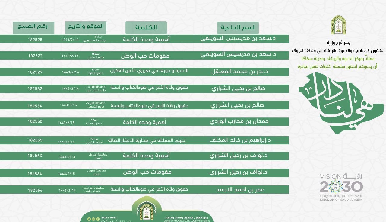 تنظم وزارة الشؤون الإسلامية والدعوة والإرشاد ممثلة بفرعها بمنطقة الجوف، مجموعة من الكلمات الدعوية بالتزامن مع ذكرى اليوم الوطني (91)، يلقيها مجموعة من الدعاة تبدأ من اليوم الثلاثاء الرابع عشر من شهر صفر 1443هـ، وتستمر لمدة يومين، في عدد من مساجد وجوامع مدينة سكاكا ومحافظات المنطقة.