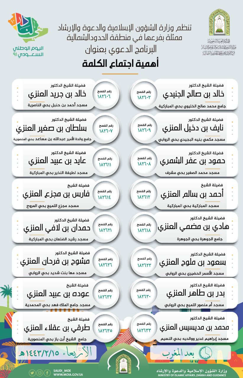 ,ثم يبين فضيلة مدير عام فرع الوزارة في منطقة الحدود الشمالية الشيخ مطارد بن دخيل العنزي إلى أن هذه المبادرة تحتوى على أكثر من 31 منشطًا دعويًّا وتوعويًّا تنفذ في مساجد وجوامع المنطقة والمحافظات التابعة ، وكذلك سَتُبَثُّ عبر البث المباشر الخاص بفرع وزارة الشؤون الإسلامية في منطقة الحدود الشمالية ، وهي تأتي تزامناً مع اليوم الوطني السعودي.