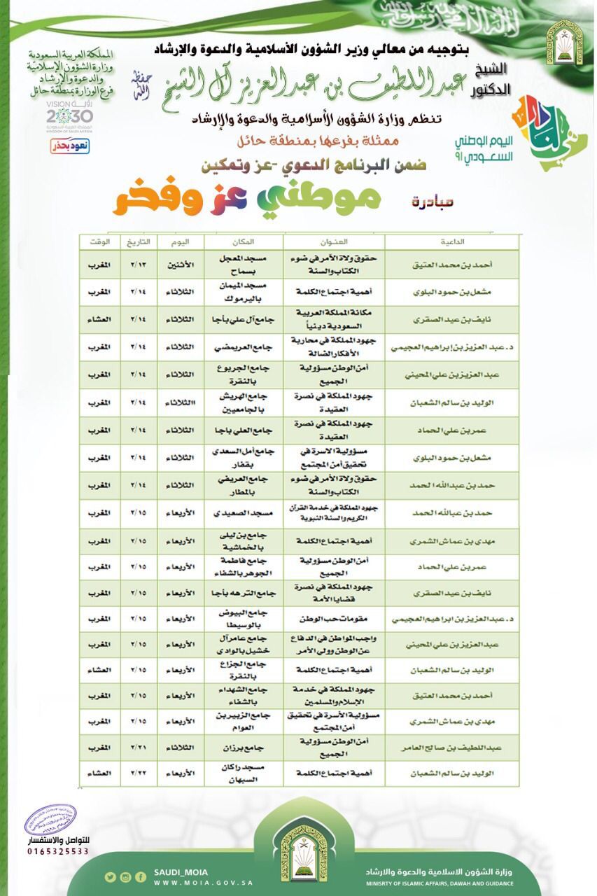 ينطلق اليوم الثلاثاء الرابع عشر من شهر صفر 1443هـ البرنامج الدعوي عز وتمكين والذي ينظمه فرع وزارة الشؤون الإسلامية والدعوة والإرشاد بمنطقة حائل ضمن مبادرة “موطني عز وفخر” والذي يستمر حتى الثاني والعشرين من الشهر الجاري، حيث يتضمن هذا البرنامج سلسلة من الكلمات الدعوية والتوعوية التي تقام في مساجد وجوامع المنطقة بعد صلاتي المغرب والعشاء والتي يلقيها عدد من الدعاة، وذلك بالتزامن مع اليوم الوطني السعودي الــ 91 .
