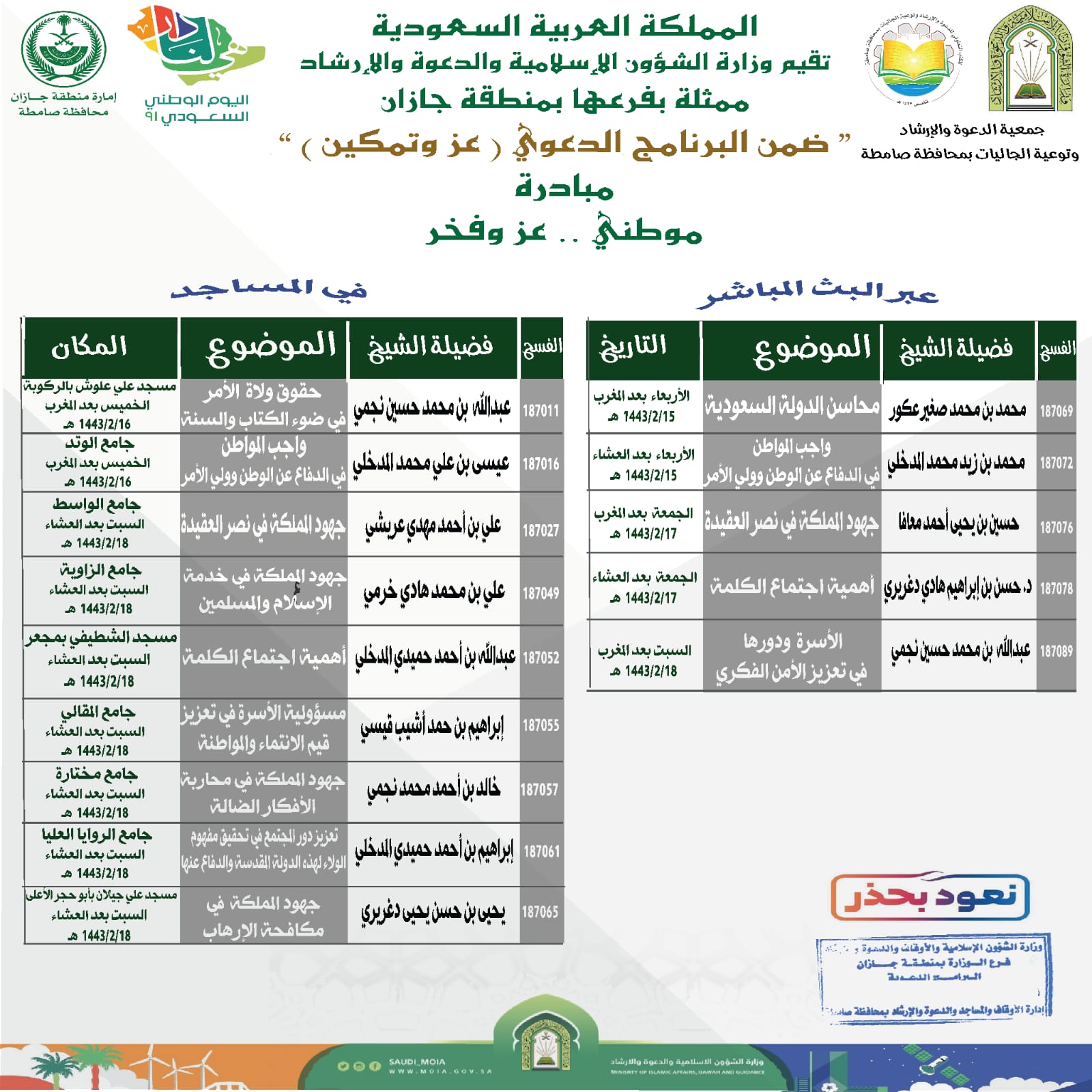 ضمن البرنامج الدعوي عز وتمكين ومبادرة وطني عز وفخر الذي تنظمه وزارة الشؤون الإسلامية والدعوة والإرشاد ممثلة بفرعها في منطقة جازان تقيم جمعية الدعوة والإرشاد وتوعية الجاليات بمحافظة صامطة عدد من المحاضرات والكلمات الدعوية عبر البث المباشر للفرع ومساجد وجوامع المحافظة والذي ينطلق مساء الأربعاء الخامس عشر من شهر صفر 1443 هجرية بمشاركة عدد من المشايخ وطلاب العلم والدعاة يتحدثون عن محاسن الدولة السعودية , وواجب المواطن في الدفاع عن الوطن وولي الأمر وكذلك اجتماع الكلمة ووحدة الصف .