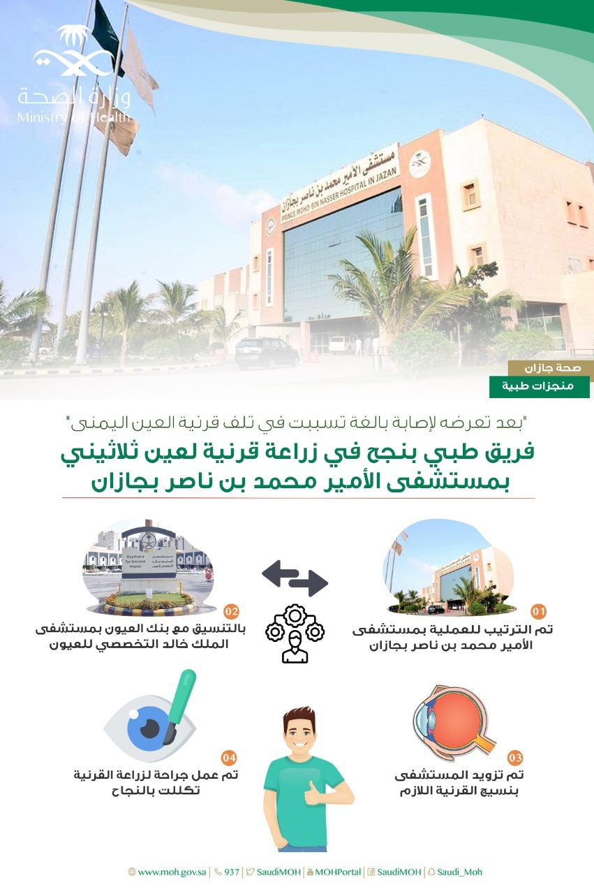 وقالت صحة جازان أنه بعد إجراء الفحوصات الطبية اللازمة تبين حاجة المريض إلى إجراء زراعة قرنية لإستعادة البصر ، لافتةً أنه بعد التنسيق مع مستشفى الملك خالد التخصصي للعيون ، فقد تم تزويد مركز العيون بمستشفى الأمير محمد بن ناصر بالقرنية ، وعلى الفور أجرى الفريق الطبي عملية زراعة قرنية للمريض تكلّلت بالنجاح ولله الحمد وبدون حدوث مضاعفات .