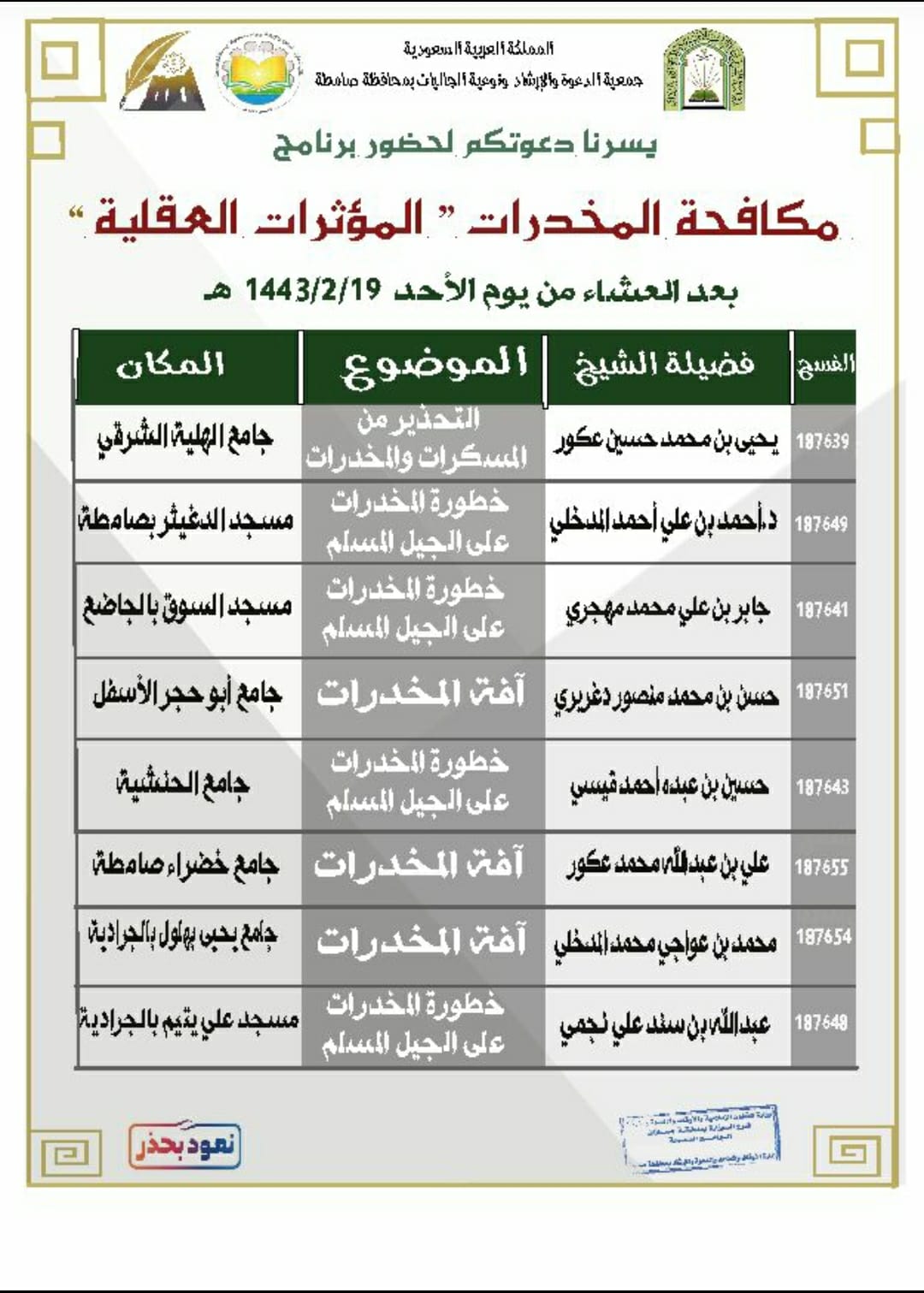 ضمن البرنامج الدعوي مكافحة المخدرات ” المؤثرات العقلية ” نظمت وزارة الشؤون الإسلامية والدعوة والإرشاد ممثلة بفرعها في منطقة جازان وبالتعاون مع جمعية الدعوة والإرشاد وتوعية الجاليات بمحافظة صامطة مساء الأحد التاسع عشر من شهر صفر 1443هجرية عدد من الكلمات الدعوية التي ألقاها أصحاب الفضيلة من دعاة الفرع والمتعاونين الذين بينو وحذروا من المسكرات والمخدرات وأثرها على الجيل المسلم وتحدثوا عن بعض أحكامها من الكتاب الكريم وسنة المصطفى صلى الله عليه وسلم كما أنهم وجهوا عدد من الرسائل المهمة للشباب والشابات لكيلا يقعوا في بؤرة تعاطي المخدرات .