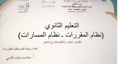 نفذت الإدارة العامة للتعليم بمنطقة مكة المكرمة ممثلة في إدارة الاشراف التربوي- قسم نظام المقررات- لقاءً تدريبيًا بعنوان ( التعليم الثانوي نظام المقررات ، نظام المسارات تطوير مجود وتعليم متنوع متميز ) يومي الأحد والاثنين الموافق12-1443/2/13هـ، نفذته رئيسة قسم نظام المقررات حياة الحازمي بإدارة التدريب والابتعاث بالمركز الأول .