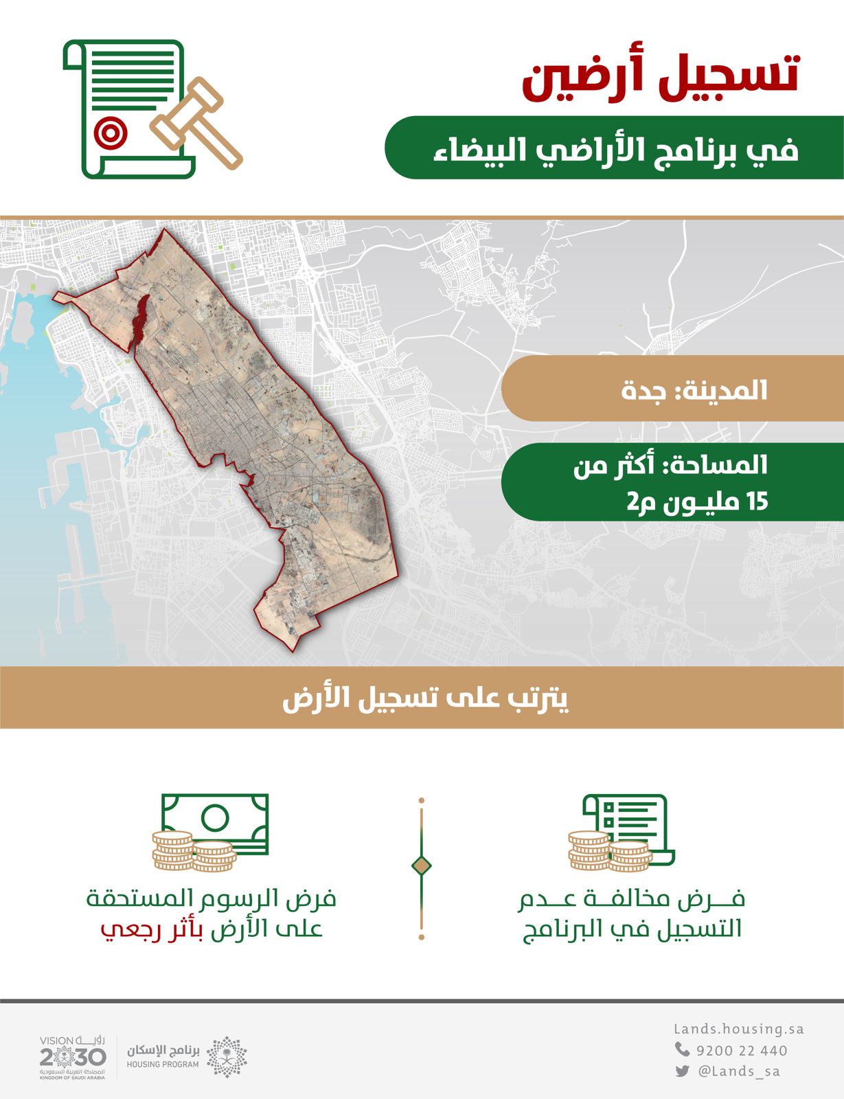 أعلن برنامج “الأراضي البيضاء” تسجيله أرضين في محافظة جدة بمساحة إجمالية بلغت 15,3 مليون م2 بعد رصد عدم تسجيلها في النظام ضمن المرحلة الأولى التي تُعنى بالأراضي غير المطورة “الخام” بمساحة 10 آلاف م2 وأكثر، والواقعة ضمن النطاق المُعلن عنه في المدن التي تم تطبيق النظام فيها.