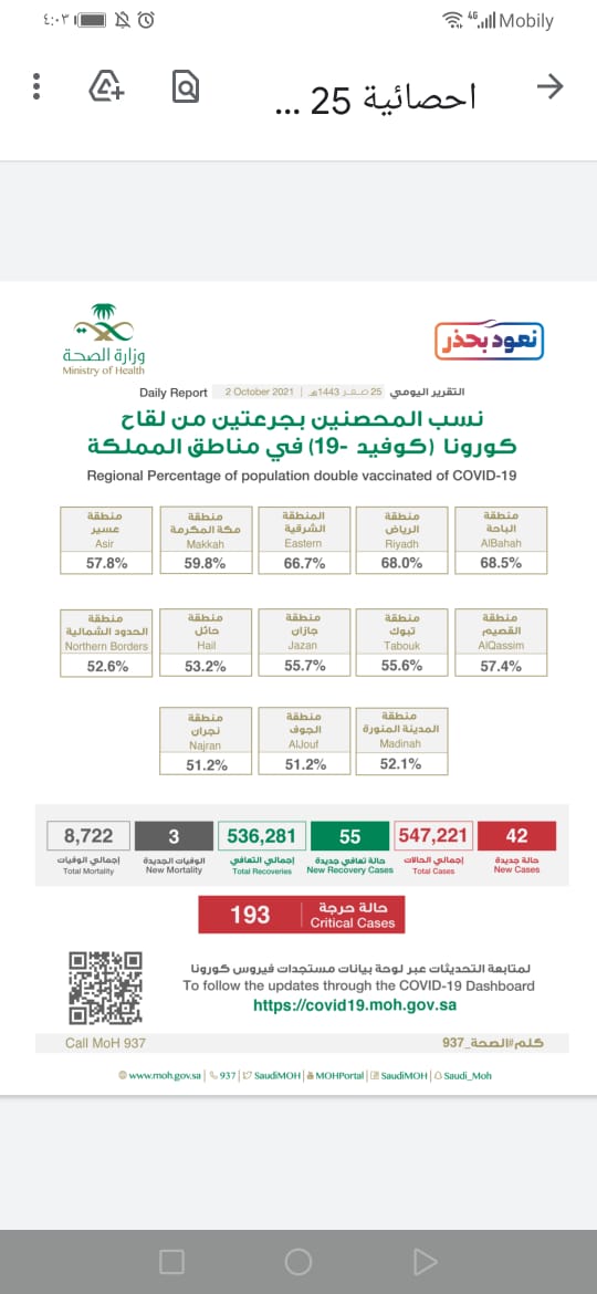وفي نفس السياق أعلنت الصحة إحصائية جديدة لمستجدات كورونا في المملكة خلال ال24 ساعة الماضية تضمنت تسجيل (42) حالة مؤكدة وتعافي(55) حالة فيما بلغ عدد الحالات الحرجة (193) حالة.