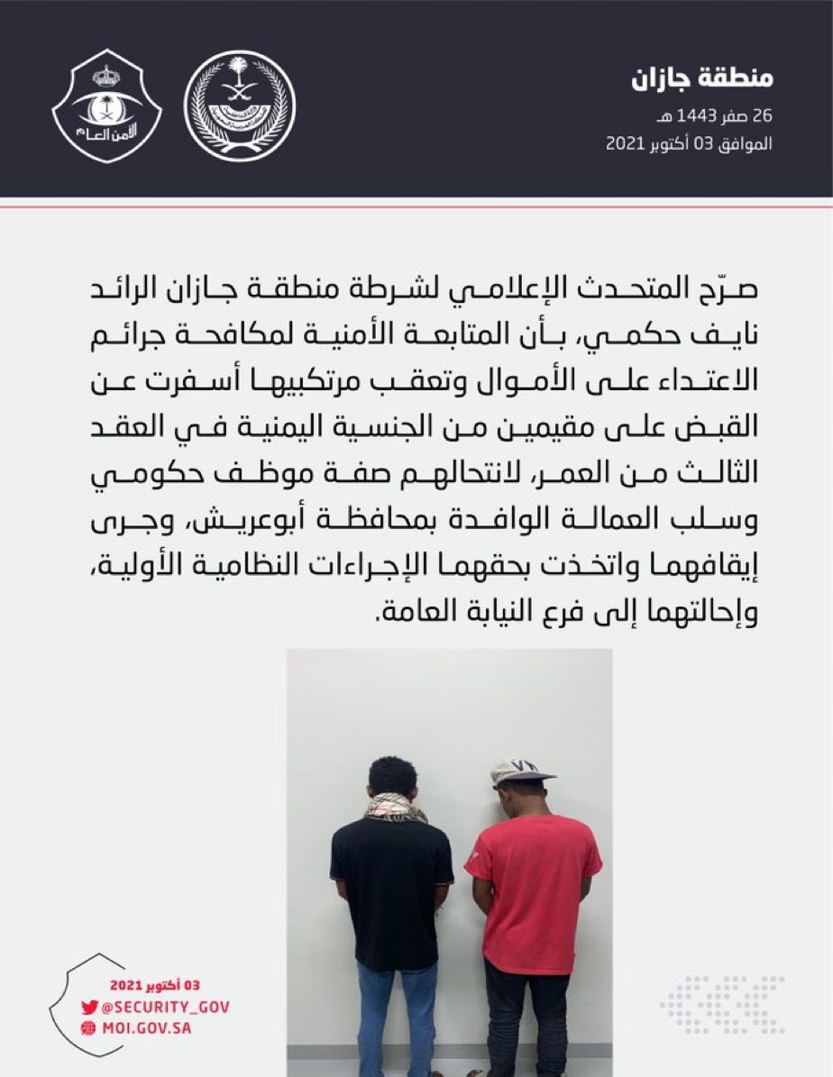صرّح المتحدث الإعلامي لشرطة منطقة جازان الرائد نايف حكمي، بأن المتابعة الأمنية لمكافحة جرائم الاعتداء على الأموال وتعقُّب مرتكبيها أسفرت عن القبض على مقيمين من الجنسية اليمنية في العقد الثالث من العمر، لانتحالهم صفة موظف حكومي وسلب العمالة الوافدة بمحافظة أبوعريش، وجرى إيقافهما واتخذت بحقهما الإجراءات النظامية الأولية، وإحالتهما إلى فرع النيابة العامة.