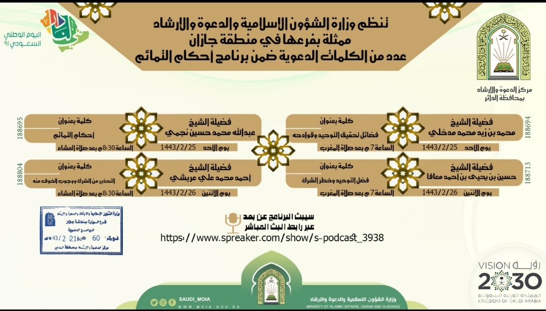 تنظم وزارة الشؤون الإسلامية والدعوة والإرشاد ممثلة بفرعها في منطقة جازان عدد من الكلمات الدعوية ضمن البرنامج الدعوي أحكام التمائم والتي انطلقت مساء الأحد السادس والعشرون من شهر صفر ١٤٤٣ هجرية بكلمة عنوانها فضل تحقيق التوحيد وقوادحه لفضيلة الشيخ محمد بن زيد مدخلي التي سيلقيها في تمام السابعة مساءاً وفي ذات الساعة يلقي فضيلة الشيخ حسين بن يحيى معافا كلمة بعنوان فضل التوحيد وخطر الشرك ، وفي تمام الثامنة والنصف مساءا ً يتحدث فضيلة الشيخ عبد الله بن محمد نجمي عن أحكام التمائم . وتختتم هذه الكلمة بكلمة لفضيلة الشيخ أحمد بن محمد عريشي عنوانها التحذير من الشرك ووجوب الخوف منه في تمام الثامنة والنصف من مساء الاثنين السادس والعشرين .