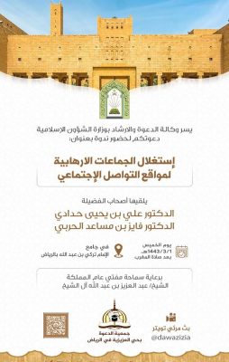 برعاية سماحة مفتي عام المملكة رئيس هيئة كبار العلماء الشيخ عبدالعزيز بن عبدالله آل الشيخ – حفظة الله – تنظم وزارة الشؤون الإسلامية والدعوة والإرشاد ممثلة بوكالة الدعوة والإرشاد، ندوة بعنوان: (استغلال الجماعات الإرهابية لمواقع التواصل الاجتماعي)، يشارك فيها كل من الدكتور علي بن يحيى حدادي، والدكتور فايز بن مساعد الحربي، في جامع الإمام تركي بن عبدالله “الجامع الكبير” بمدينة الرياض، بعد صلاة المغرب غداً الخميس.