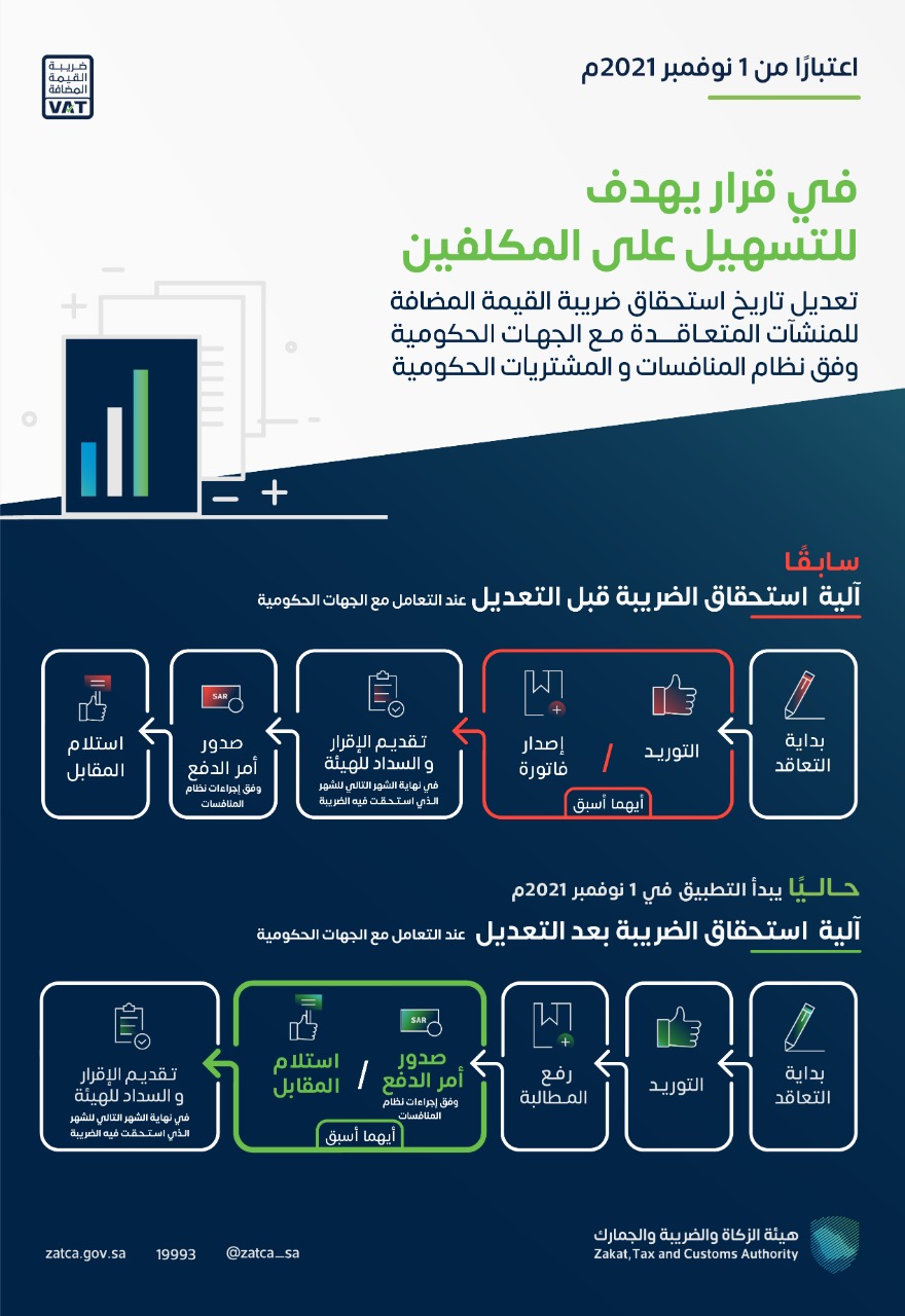 يُذكر أن المنشآت المتعاقدة مع الجهات الحكومية كانت تقوم بالإقرار عن الضريبة المستحقة عن المطالبات المرفوعة للجهات الحكومية ضمن الإقرار الضريبي للفترة الضريبية التي تم فيها التوريد فعلياً أو إصدار مطالبة للجهة الحكومية أو التي تم فيها تلقي مقابل التوريد كليًا أو جزئيًا أيها أسبق، في حين أنه بموجب التعديل الذي أعلنت عنه الهيئة اليوم سيُعد التوريد الذي تم مع جهة حكومية وفق عقود مبرمه طبقاً لنظام المنافسات والمشتريات الحكومية واقعًا ويتم الإقرار عن الضريبة المستحقة بموجبه ضمن الإقرار الضريبي للفترة الضريبية التي يتم خلالها إصدار أمر الدفع للمنشأة أو التي يتم فيها تلقي مقابل التوريد كليًا أو جزئيًا أيهما أسبق، ووفقًا للمبلغ الذي صدر به أمر الدفع بما يضمن تلقي المورد المتعاقد مع الجهات الحكومية الضريبة المستحقة على توريده قبل الإقرار عنها وسدادها للهيئة.