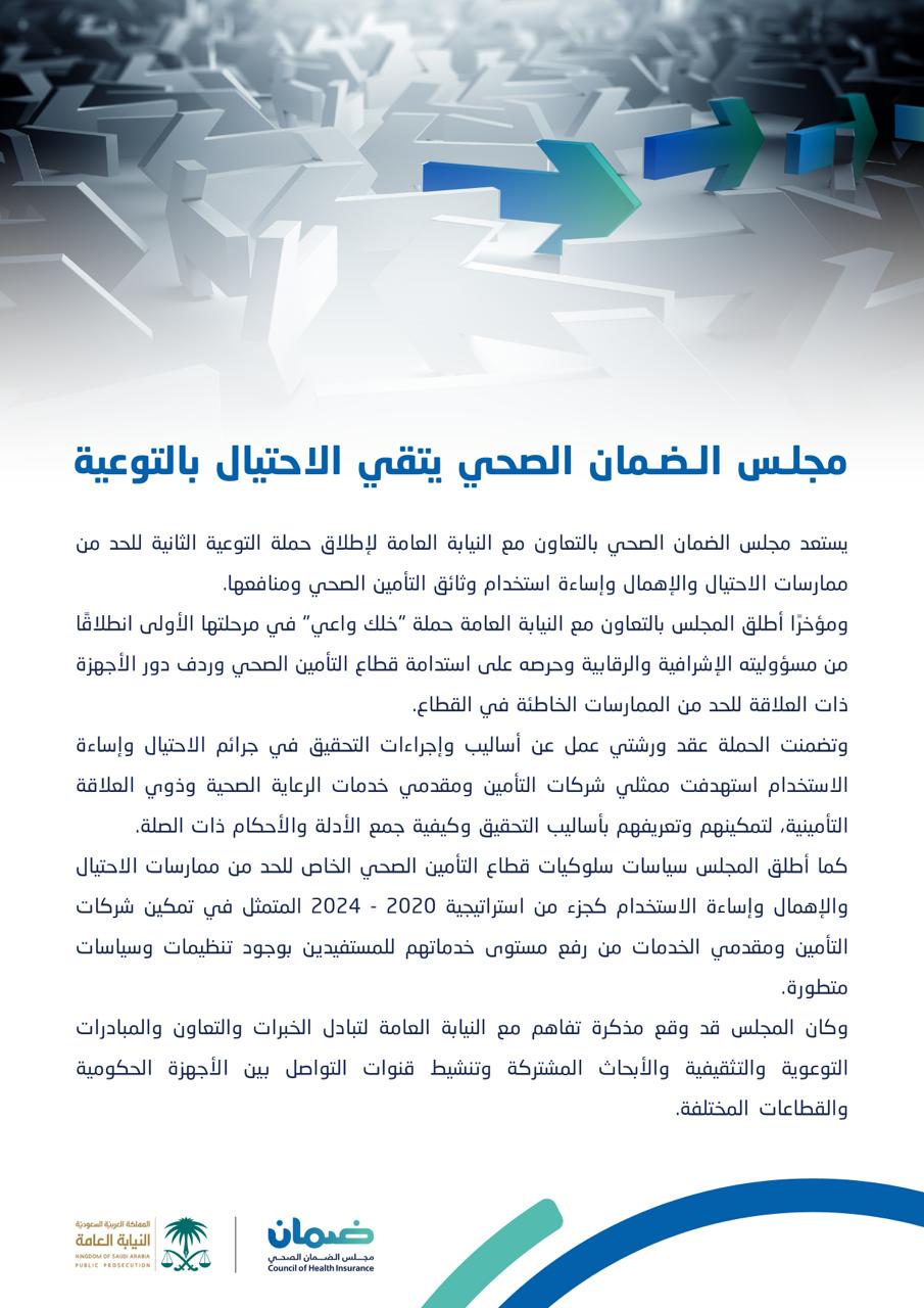 ومؤخرًا أطلق المجلس بالتعاون مع النيابة العامة حملة “خلك واعي” في مرحلتها الأولى انطلاقًا من مسؤوليته الإشرافية والرقابية وحرصه على استدامة قطاع التأمين الصحي وردف دور الأجهزة ذات العلاقة للحد من الممارسات الخاطئة في القطاع.