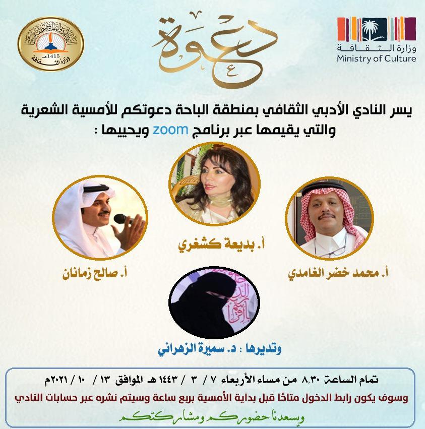 والشاعرة بديعة كشغري والشاعر صالح زمانان وتُدير الأمسية الدكتورة سميرة الزهراني هذا وسيتم بث الأمسية في تمام الساعة الثامنة والنصف مساء الأربعاء ، عبر برنامج zoom وسيفتح الرابط قبل الأمسية بربع ساعة . وأشار رئيس النادي الأدبي الثقافي بالمنطقة حسن بن محمد الزهراني بأن هذه الأمسية الشعرية التي تضم نخبة من شعراء الوطن تأتي امتداداً لبقية الأمسيات التي يقيمها النادي في سياق الأنشطة المتنوعة إرضاءً لجميع الأذواق والأطياف الأدبية والثقافية وسيتم حفظها في موقع النادي على اليوتيوب بعد انتهاء الأمسية.