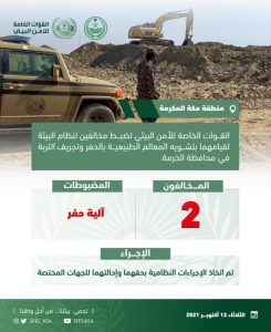 ضبطت القوات الخاصة للأمن البيئي مواطنًا ومقيمًا من الجنسية السودانية مخالفَين لنظام البيئة، لقيامهما بتشويه المعالم الطبيعية بالحفر وتجريف التربة في محافظة الخرمة بمنطقة مكة المكرمة.