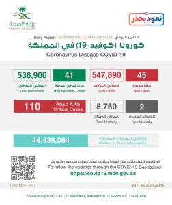 أخبار محلية > “الصحة”: 45 إصابة جديدة بكورونا وتعافي 41