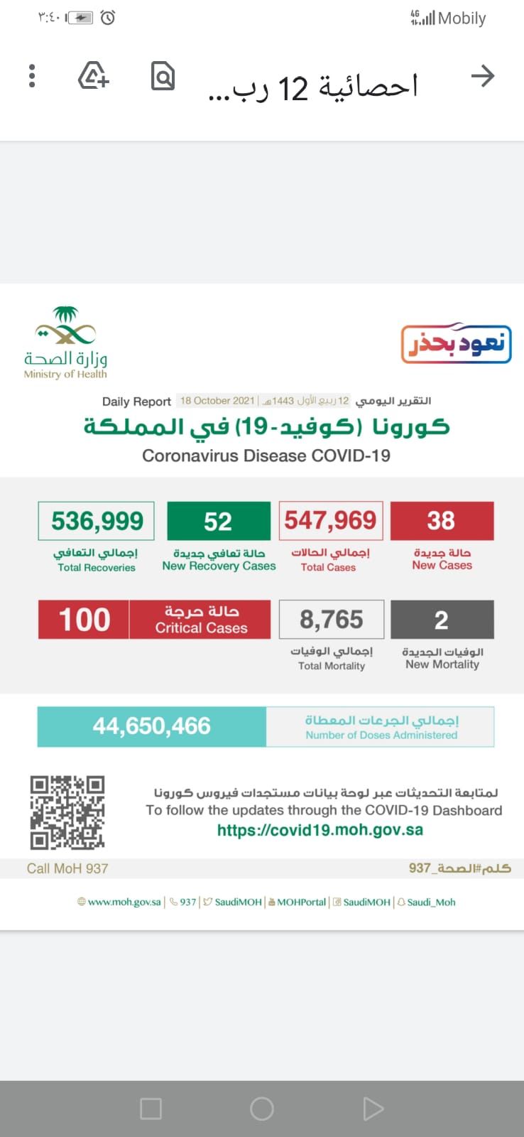 وفي نفس السياق أعلنت الصحة إحصائية جديدة لمستجدات كورونا في المملكة خلال ال24 ساعة الماضية تضمنت تسجيل (38) حالة مؤكدة وتعافي(52) حالة فيما بلغ عدد الحالات الحرجة (100) حالة.