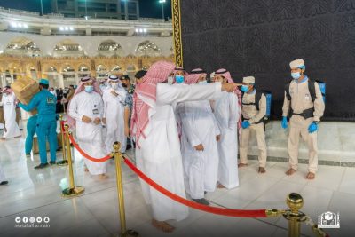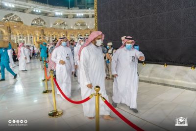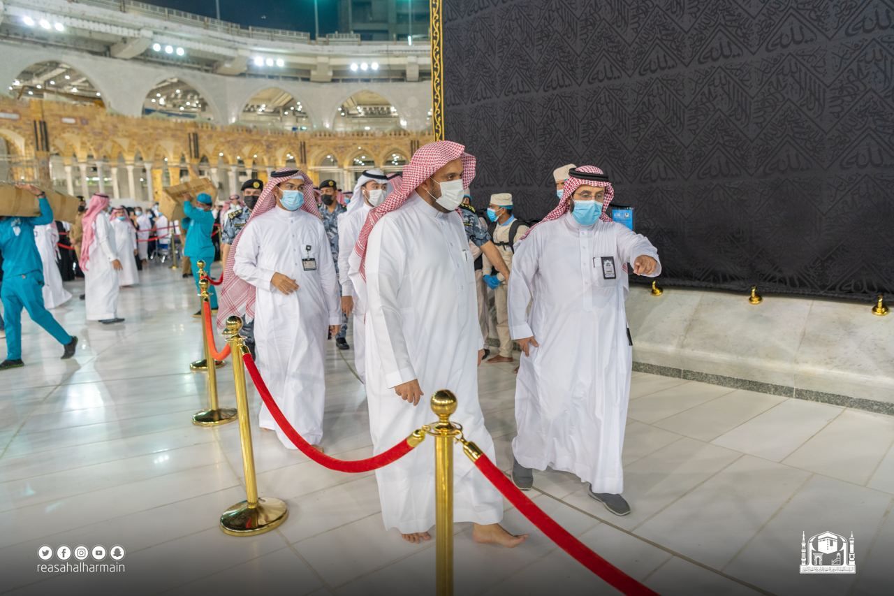 من جهته قام مساعد الرئيس العام المكلف وكيل شؤون المسجد الحرام الدكتور/ سعد بن محمد المحيميد بجولة ميدانية داخل المسجد الحرام والمطاف للاطمئنان على الجاهزية التامة لإستقبال المعتمرين والمصلين في المسجد الحرام، بكامل الطاقة الاستيعابية لضمان تطبيق الإجراءات الاحترازية . وشدد على عموم العاملين بالمسجد الحرام بتطبيق جميع الإجراءات الاحترازية والتقيد بجميع التعليمات والتوجيهات الصادرة من الجهات المعنية بمكافحة فايروس كورونا المستجد حيث رفعت الرئاسة العامة حالة الاستعداد للقوى العاملة وعمليات التعقيم والتطهير وتجهيز المئات من مضخات التعقيم، فضلآ عن استمرار التباعد ولبس الكمامات وحجز المواعيد للعمرة والصلاة من خلال التطبيقات الإلكترونية الرسمية (اعتمرنا، توكلنا).