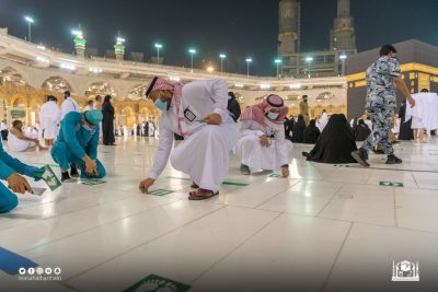 وبدا منظر منسوبي الرئاسة العامة لشؤون المسجد الحرام والمسجد النبوي بإزالة ملصقات التباعد الجسدي داخل المسجد الحرام والتي اعتمدتها الرئاسة العامة مع بداية الجائحة ، كمشهد تاريخي أنهى زمن الجائحة التي أدت إلى هزّة ارتدادية عالمية أعادت العالم إلى واقع شديد القساوة حيث سببت أكبر ضرر اقتصادي وسياسي واجتماعي، لم تشهده البشرية منذ الحرب العالمية الثانية. إلا أن قيادة المملكة سخرت كافة امكانياتها للتعامل وفق البروتوكولات الصحية العالمية للتصدي للجائحةً وفق الإجراءات الاحترازية واستخدام التقنية الذكية والروبوتات الذكاء الاصطناعي والتقنيات الحديثة لخدمة قاصدي الحرمين الشريفين والحجاج خلال جائحة كورونا والتي لعبت دورًا كبيرًا في تعزيز عمل منظومة الرئاسة وتحسين الاداء التشغيلي وفق الرؤية ٢٠٣.