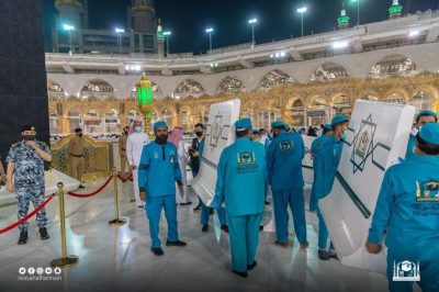 لم تكن لحظات تغيير الحواجز البلاستكية حول الكعبة المشرفة والتي وضعت مع بداية ظهور جائحة فايروس كورونا، لحظات عادية لمنسوبي رئاسة الحرمين فقد ارتسمت الفرحة الغامرة وهم يقومون بإزالتها ووضع حواجز شريطية ، بهدف تغير الهوية البصرية للكعبة المشرفة وصحن المطاف بشكل مميز وجميل.