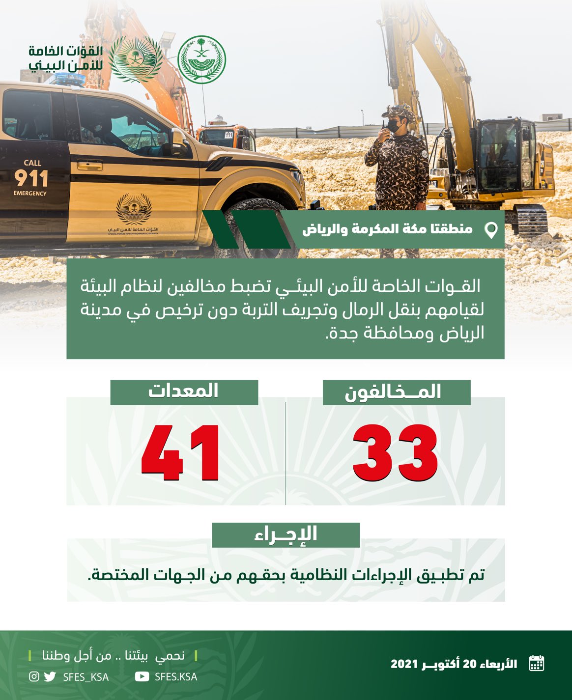 ضبطت القوات الخاصة للأمن البيئي (33) مخالفًا لنظام البيئة لقيامهم بنقل الرمال وتجريف التربة دون ترخيص في مدينة الرياض ومحافظة جدة.