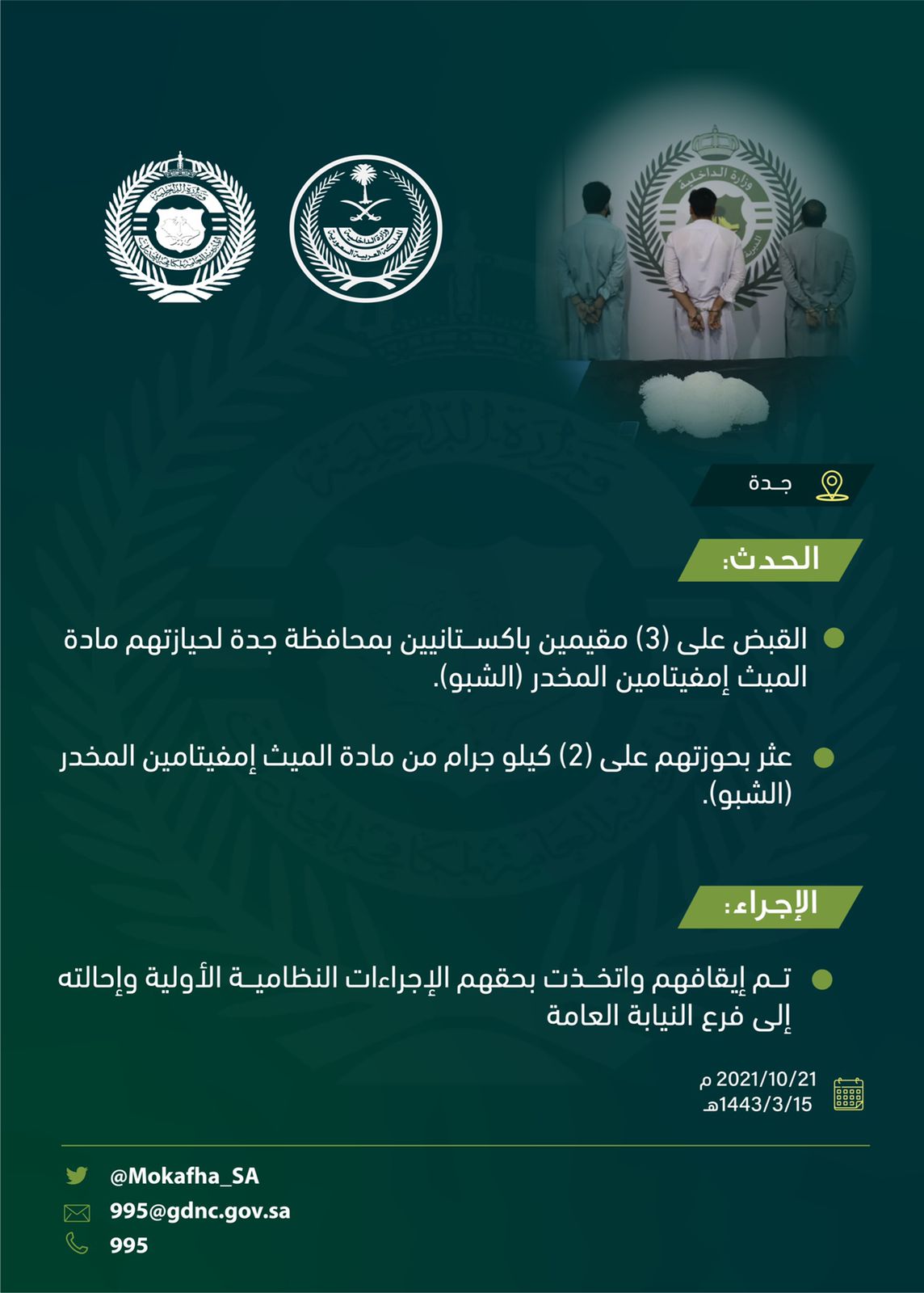 صرح المتحدث الرسمي للمديرية العامة لمكافحة المخدرات الرائد محمد النجيدي، بأن المتابعة الأمنية الاستباقية لنشاطات الشبكات الإجرامية التي تستهدف أمن وشباب المملكة بتعاطي وترويج المخدرات، أسفرت عن القبض على (3) مقيمين من الجنسية الباكستانية بمحافظة جدة، بحوزتهم (2) كيلو جرام من مادة الميث إمفيتامين المخدر (الشبو).