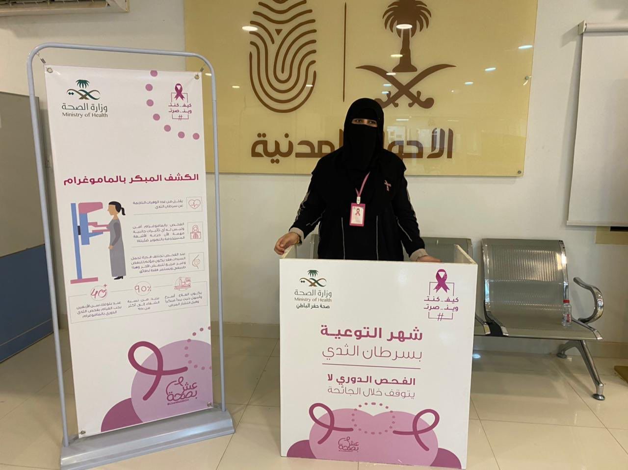 أقامت صحة حفر الباطن بالتعاون مع الأحوال المدنية النسائية ركن توعوي لحملة سرطان الثدي تحت شعار “كيف كنت وين صرت ” وتهدف الحملة إلى توعية النساء بأهمية التشخيص المُبكر للوقاية من سرطان الثدي, وشملت الحملة على توعيتهن حول سرطان الثدي، ومسبباته، وطرق الوقاية منه، بالإضافة إلى حثهن على أهمية الكشف المبكر لمن فوق سن الأربعين وذلك من خلال المبادرة إلى حجز مواعيد عبر تطبيق صحتي او من خلال عيادات الفحص في مستشفى الملك خالد ، ومستشفى الولادة والاطفال ، ومستشفى حفر الباطن المركزي.