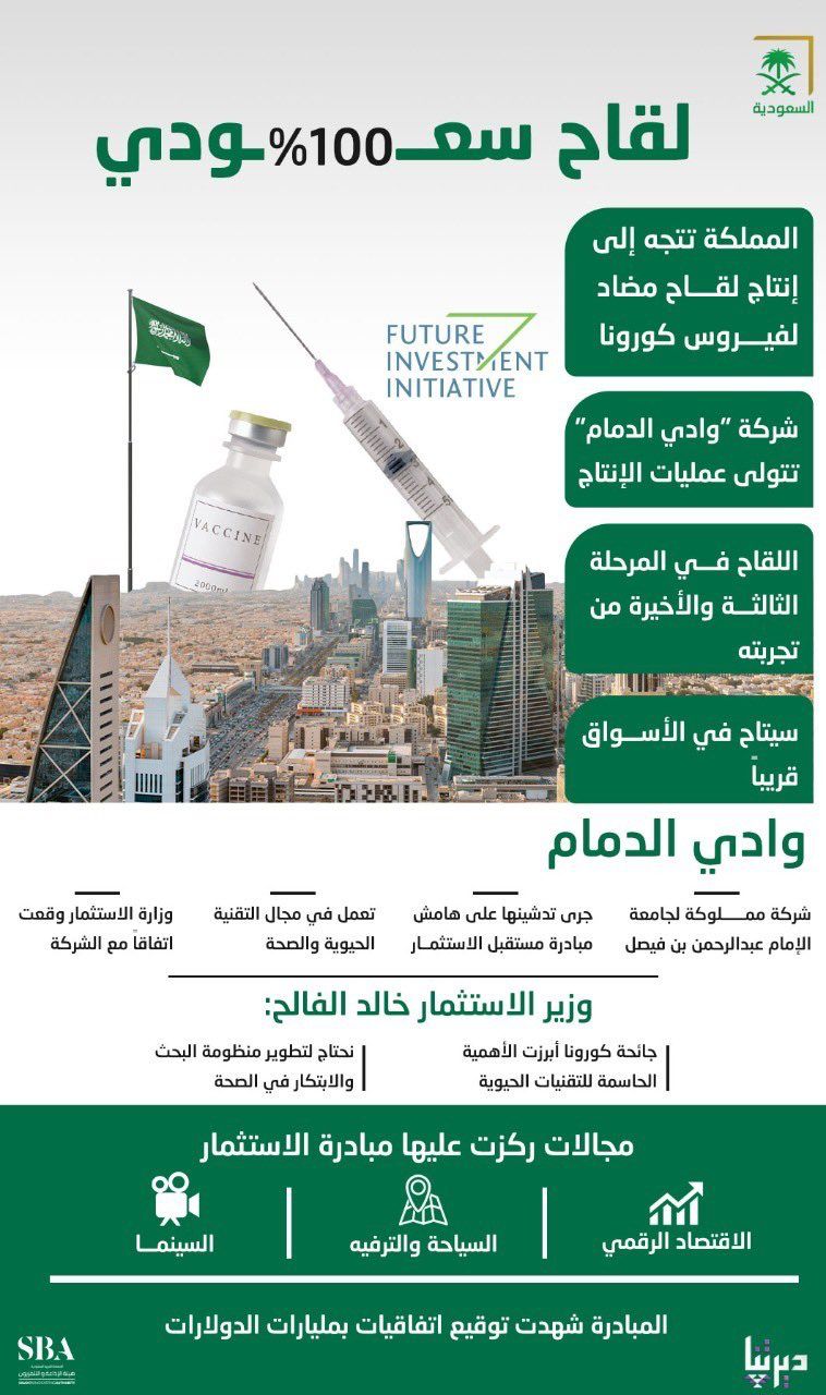 يشار إلى أنه من المقرر، أن تتولى شركة وادي الدمام عملية إنتاج اللقاح الذي هو حاليًا في المرحلة الثالثة والأخيرة من تجربته، على أن يتاح في الأسواق قريبًا.