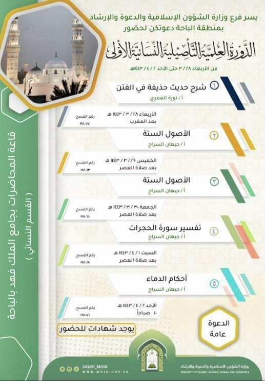 يعلن فرع وزارة الشؤون الاسلامية والدعوة والارشاد بمنطقة الباحة بدء انطلاق الدورة التأهيلية النسائية الأولى بمنطقة الباحة يوم الاربعاء الموافق 1443/3/28هـ وتستمر لمدة أربعة أيام للأستاذه جيهان بنت محمد السراج والاستاذة نوره العمري بقاعة المحاضرات بجامع الملك فهد بالباحه والدعوة خاصة بالنساء ويوجود شهادات للحضور