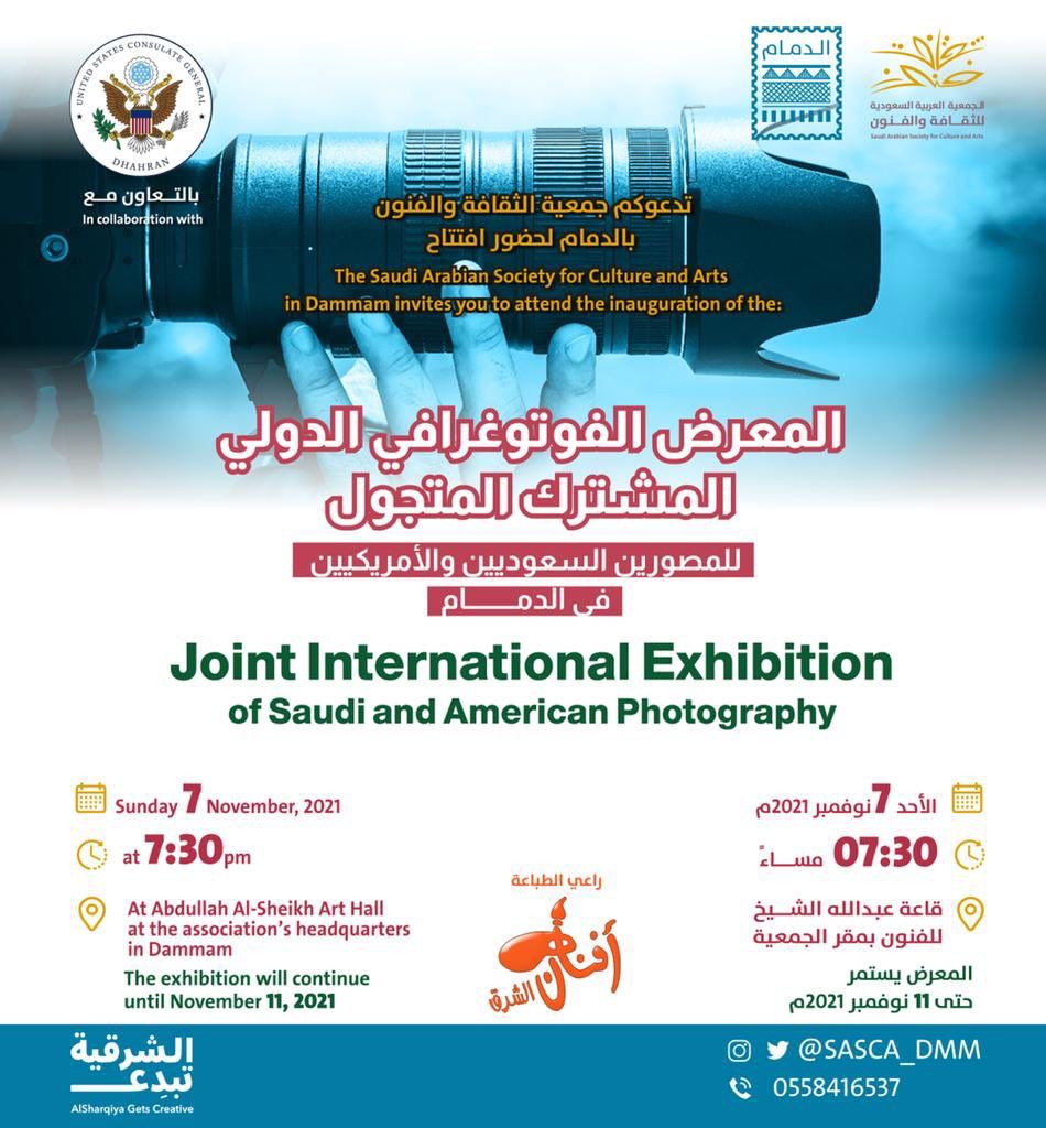 بالتعاون مع الجمعية العربية السعودية للثقافة والفنون في الدمام يفتتح القنصل العام الأمريكي في القنصلية الأمريكية في الظهران ديفيد إدجينتون الأحد المقبل 7 نوفمبر معرضًا دوليًا مشتركًا يعرض أعمال عدد من المصورين الأمريكيين والسعوديين، في قاعة عبدالله الشيخ للفنون بمقر الجمعية، في الفترة من 7 إلى 11 نوفمبر ٢٠٢١م.
